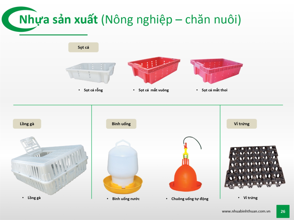 Là đơn vị sản xuất các sản phẩm nhựa số 1 miền Bắc. Ngoài các sản phẩm nhựa công nghiệp nhưa: Pallet, thùng rác, thùng nhựa công nghiệp, khay đựng linh kiện, can nhựa… Hay các sản phẩm chậu nhựa trồng cây, trồng hoa, khay ươm, chậu trồng rau sạch… Tập đoàn cơ khí Nhựa Bình còn được biết đến là đơn vị chuyên sản xuất và cung cấp các sản phẩm nhựa nông nghiệp chất lượng, giá thành rẻ như: Máng ăn, máng uống cho cho công nghiệp, cho vịt, lợn….; Lồng gà, sọt, vỉ trứng, sàn nhựa các loại.